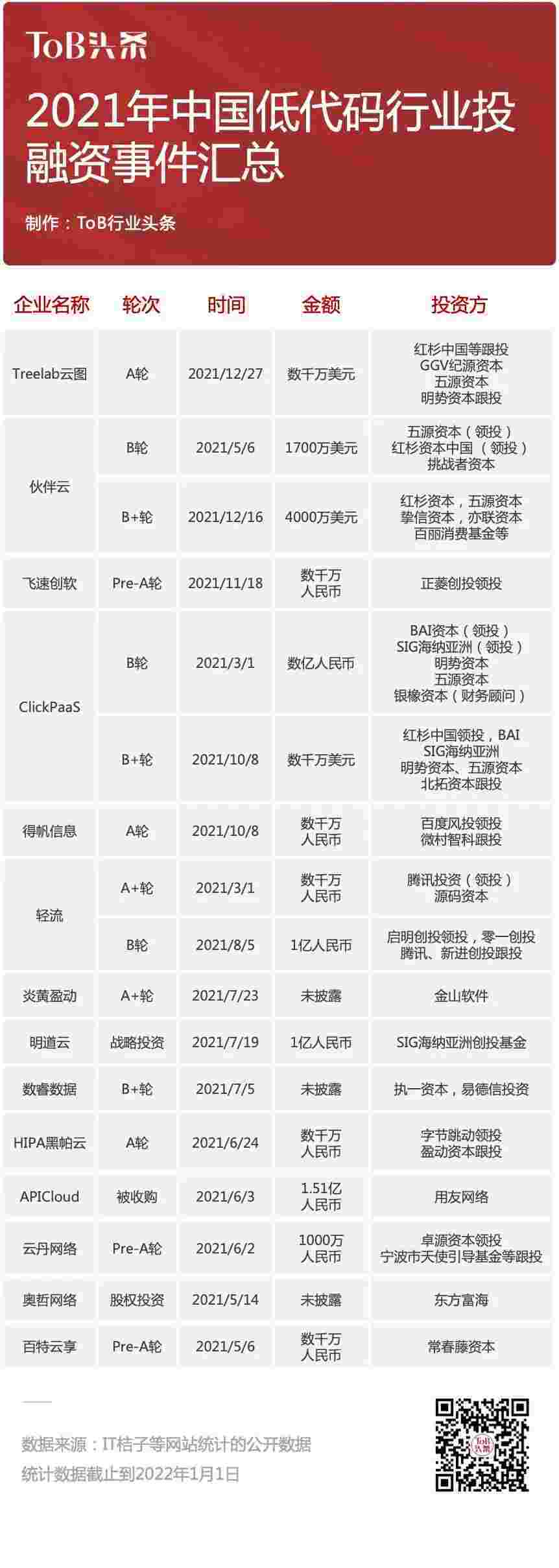 到2021年,,,无/低代码投融资规模势头更甚,,,,其中包括轻流两轮融资(A+轮数千万人民币,,B轮近亿人民币)、、、、NO钱包 两轮融资(B轮数亿人民币,,,B+轮数千万美元)、、、、百特云享数千万元Pre-A轮融资......